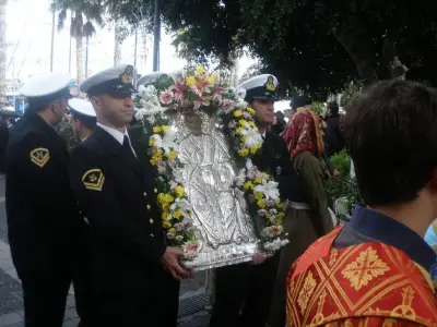 Την κυριώνυμο ημέρα χοροστάτησε κατά τον όρθρο και προεξήρχε της πανηγυρικής Θείας Λειτουργίας, καθώς και της ιεράς Λιτανείας, η οποία πραγματοποιήθηκε παρά τη βροχή και τον αέρα, ο Σεβασμιώτατος Μητροπολίτης Κώου και Νισύρου κ. Ναθαναήλ, συμπαραστατούμενος από τον ηγούμενο της Ιεράς Μονής Ιβήρων Πανοσιολογιώτατο Αρχιμανδρίτη Ναθαναήλ, τον Πρωτοσύγκελο της Μητροπόλεώς μας Πανοσιολογιώτατο Αρχιμανδρίτη Χρυσόστομο Πίτση, το Γενικό Αρχιερατικό Επίτροπο Πρωτοπρεσβύτερο Ιωάννη Διακοπαναγιώτη και τους ιερείς της πόλεως της Κω.