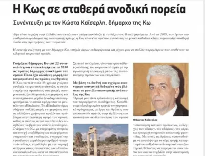 Η Κως τα τελευταία 35 χρόνια γνώρισε ραγδαία τουριστική ανάπτυξη, η οποία στηρίχτηκε πρωτίστως στις µικρές οικο- γενειακέςξενοδοχειακέςεπιχειρήσειςκαι ενσυνεχείασταµεγάλαξενοδοχειακάσυγ- κροτήµατα, τα οποία εφάρµοσαν το µον- τέλοτουallinclusive.Το allinclusive όµως οδήγησε πολλές µικρές επιχειρήσεις στο να αλλάξουν χρήση και προξένησε πρό- βληµα στην ευρύτερη αγορά του νησιού, καθώςοιπελάτεςαυτούτουτύπουδενσυ- νηθίζουν να βγαίνουν από το ξενοδοχείο. Ο∆ήµοςτηςΚω,µεστοχευµένεςκινήσεις καισυνεχήαναβάθµισητωνπαρεχόµενων υπηρεσιών και υποδοµών, επιχειρεί την προσέλκυσηµεγαλύτερουαριθµού«τουρι- στών πόλης», παράλληλα µε την παροχή κινήτρων στους επισκέπτες των all inclu- siveκαταλυµάτων,ώστεναεπισκέπτονται την κοντινότερη πόλη ή κοινότητα. Ωστόσο,τοτουριστικόπροϊόν,έτσιόπως διαµορφώθηκετατελευταία35χρόνια,εί- ναι γηρασµένο, και απαιτούνται δράσεις αναζωογόνησης του, ώστε να διασφαλί- σουµε την ιδιαίτερα σηµαντική θέση που κατέχειηΚωςστοδιεθνέςτουριστικόπε- ριβάλλον. Σε αυτό το πλαίσιο, γίνονται προσπάθει- εςσύνδεσηςτουτουριστικούτοµέαµετην πρωτογενή παραγωγή µέσω της πιστο- ποίησης προϊόντων και υπηρεσιών.