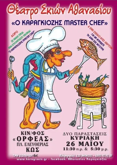 Και για τους μικρούς μας φίλους, την Κυριακή 26/5, το Θέατρο Σκιών Αθανασίου παρουσιάζει το έργο «Ο Καραγκιόζης Master Chef».