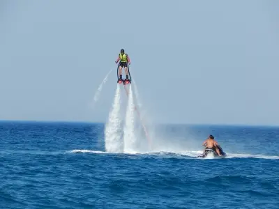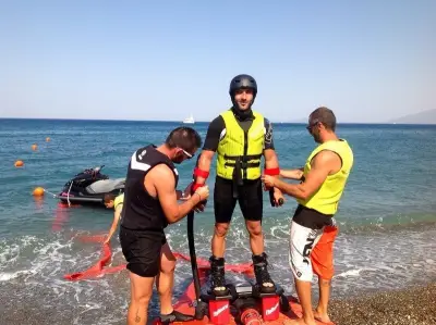Πρόκειται για ένα τζετ-σκι στο οποίο έχει τοποθετηθεί ένα μεγάλο λάστιχο. Η συσκευή ρουφάει νερό και στην συνέχεια το απομακρύνει με μεγάλη δύναμη με αποτέλεσμα ο χρήστης που είναι συνδεδεμένος μαζί της να μπαίνει και να βγαίνει από το νερό με μεγάλη ταχύτητα και με πολλούς τρόπους. Το Flyboard έχει ιπποδύναμη 100 ίππων και μπορεί να «εκτοξεύσει» κυριολεκτικά κάποιον μέσα από το νερό σε ύψος μέχρι και δέκα μέτρα!