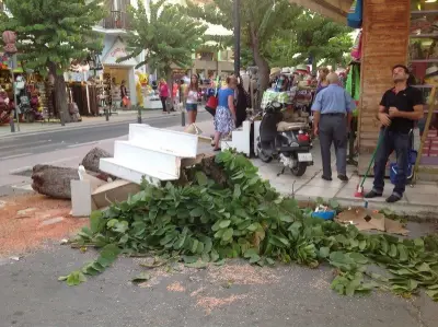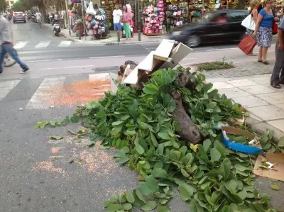 Το δέντρο του οποίου ο κορμός ήταν κούφιος έπεσε ξαφνικά κάνοντας τους περιοίκους να παγώσουν ακούγοντας τον εκκωφαντικό θόρυβο που έκανε κατα την πτώση του.όπως μας δήλωσαν κάτοικοι της περιοχής εκείνη την στιγμή δεν περνούσε κάποιος άνθρωπος απο το σημείο και ευτυχώς που το δέντρο δε έπεσε στο δρόμο αλλα έπεσε προς το κατάστημα αλλιώς σίγουρα θα ειχάμε θύματα.