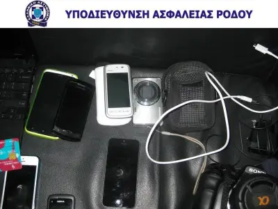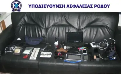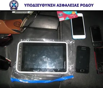 Σε δωμάτιο ξενοδοχείου στην πόλη της Ρόδου, όπου διέμεναν οι δράστες βρέθηκαν και κατασχέθηκαν: (9) κινητά τηλέφωνα, (5) ζευγάρια γυαλιών ηλίου-οράσεως, (2) φορητοί υπολογιστές, κυάλια, (2) mp3 players, (2) φακοί, (3) ψαλίδια και το χρηματικό ποσό των 2.000 ευρώ.