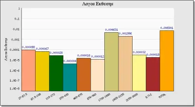 | Στο ιστόγραμμα παρουσιάζεται σε λογαριθμική κλίμακα η ένταση του ηλεκτρικού πεδίου στα σημεία όπου πραγματοποιήθηκαν μετρήσεις. Το απεικονιζόμενο όριο αντιστοιχεί στο «αυστηρότερο» όριο – αριθμητικά μικρότερο όριο – των περιοχών συχνοτήτων όπως παρουσιάζονται στο ακόλουθο διάγραμμα “πίτας” | |