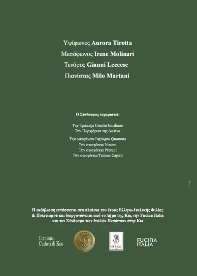 Κυριακή 6 Οκτωβρίου (11:00): Τελετή με τη συμμετοχή της Φιλαρμονικής του Δήμου της Κω στη μνήμη των εκτελεσθέντων Ιταλών Αξιωματικών στο Εκθεσιακό Κέντρο Νεότερης Ιστορίας & Ιταλικής Αρχιτεκτονικής.