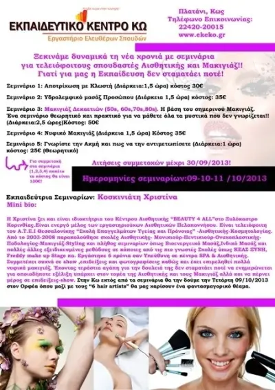 Μαζί τους θα είναι η Χριστίνα Κοσκινιάτη στο κομμάτι της Αισθητικής και του Μακιγιάζ όπου θα διδάξει Επαγγελματίες Αισθητικούς και τελειόφοιτους σπουδαστές Αισθητικής πολλά πρωτότυπα σεμινάρια.