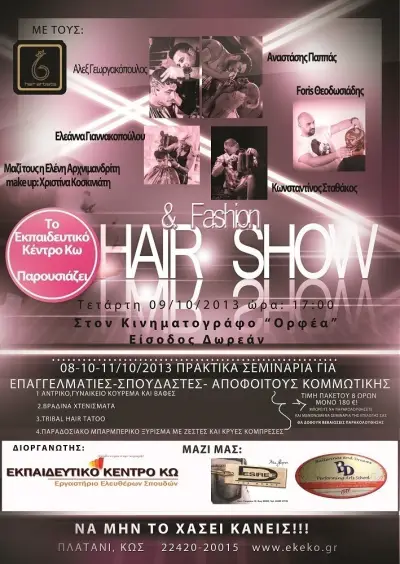 Το show θα πραγματοποιηθεί τις ώρες 17:00- 21:00 στον χειμερινό κινηματογράφο « ΟΡΦΕΑ» της Κω. Η είσοδος θα είναι δωρεάν προς το κοινό. Θα πραγματοποιηθεί επίδειξη χτενισμάτων 2013, κουρεμάτων αντρικών και γυναικείων , Tribal hair tattoo καθώς και αντρικού παραδοσιακού μπαρμπέρικου ξυρίσματος με ζεστές και κρύες κομπρέσες.Μαζί μας θα είναι το κατάστημα Desire και η Σχολή χορού «Ballarinas and Dreams". Σας περιμένουμε όλους για ένα θέαμα διαφορετικό.