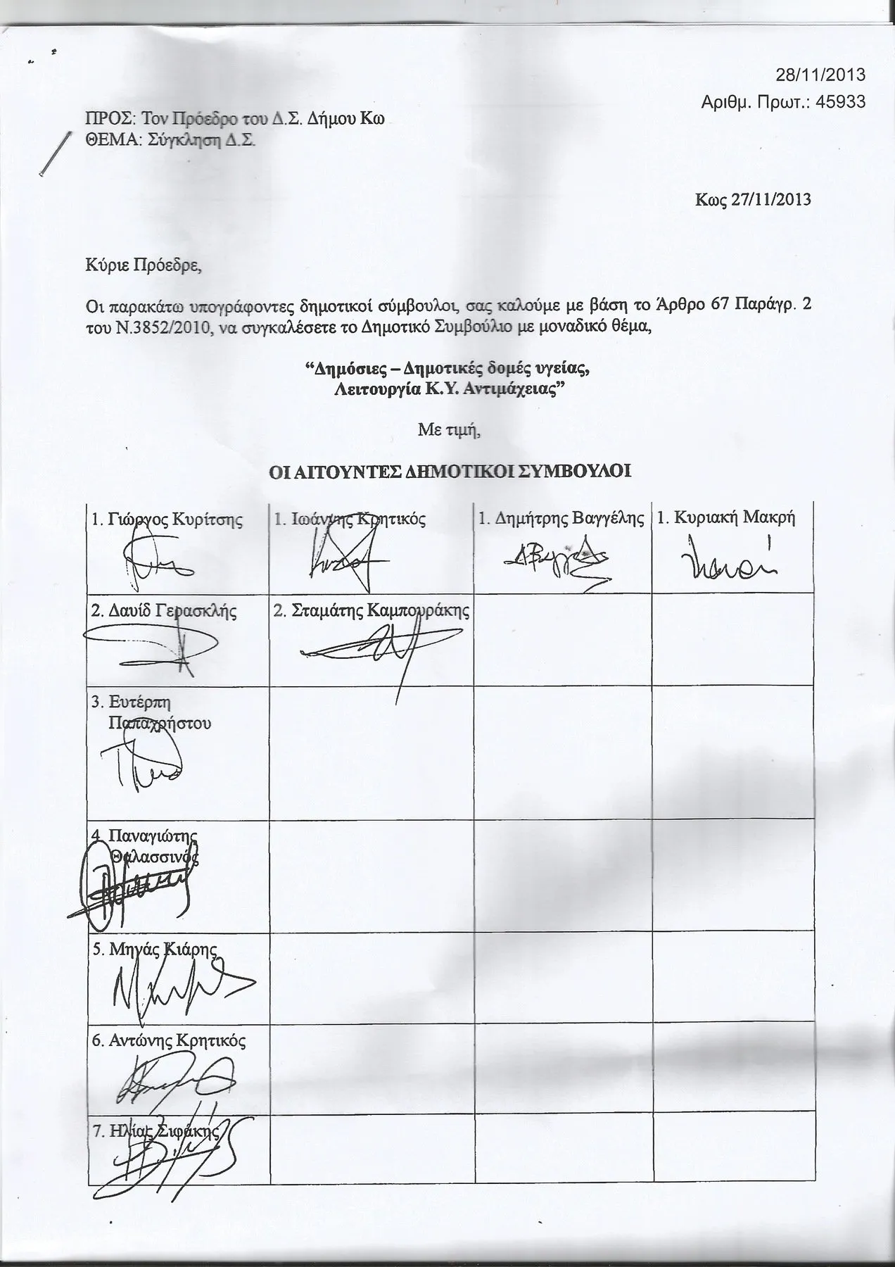 Απευθύνομαι στον Πρόεδρο του Δημοτικού Συμβουλίου και του επισημαίνω ότι στη συγκεκριμένη συνεδρίαση οφείλει να προσκαλέσει τον Ιατρικό Σύλλογο Κω αλλά και τους νοσοκομειακούς γιατρούς.''