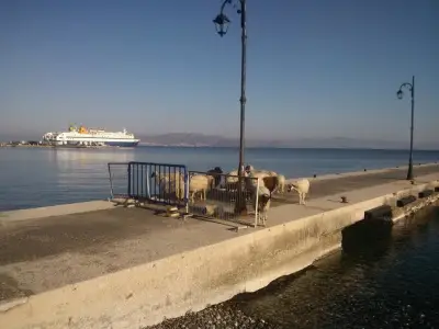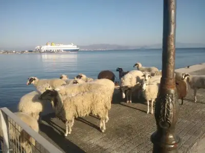 Είναι ένα από τα αρνιά που την Κυριακή το πρωί, (μιας ανοιξιάτικης μέρας), ήταν μαζεμένα πάνω στην σκάλα του πολεμικού, στην είσοδο της οποίας είχαν τοποθετηθεί κινητά περιφράγματα για να τα περιορίσουν. Τι ήθελαν τα ζωντανά στην σκάλα; Ποιος και γιατί τα μάντρωσε εκεί; Είχαν όλα το διακριτικό κίτρινο σήμα που σημαίνει ότι δεν ήταν αδέσποτα. Περαστικός που πλησίασε βλέποντας το παράξενο θέαμα σχολίασε, πικρόχολα: '' Φαίνεται προετοιμάζουν τα εγκαίνια του μόλου των ...κρουαζιερόπλοιων! και πρέπει να μαζευόμαστε!!!''