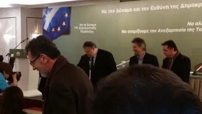 Επίσης άσκησε κριτική προς τον ΣΥΡΙΖΑ και αναρωτήθηκε αν νέο και προοδευτικό είναι η συμμαχία ΣΥΡΙΖΑ και ΑΝΕΛ θέτοντας το τεράστιο δίλημμα των επικείμενων εκλογικών αναμετρήσεων "ολοκλήρωση της στρατηγικής εξόδου από την κρίση και επάνοδος στις αγορές ή μια άλλη στρατηγική αβέβαιη χωρίς σχέδιο και πρόγραμμα", ενώ παράλληλα προκάλεσε την αντιπολίτευση εντός και εκτός ΠΑΣΟΚ "που βγαίνει από τα Αριστερά" να πει ευθέως και τοποθετηθούν υπεύθυνα αν μπορεί αν υπάρξει μια άλλη κυβέρνηση τώρα με άλλον τρόπο και αλλού".
