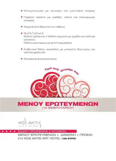 Επίσης ειδική προσφορά για όσα ζευγάρια θέλουν να κάνουν την μέρα ξεχωριστή, συνδυάστε το δείπνο σας με διαμονή στο πολυτελές Kos Aktis Art Hotel με €100 ευρώ τα 2 άτομα (μενού ερωτευμένων, διαμονή στο ξενοδοχείο και πλούσιο πρωινό)