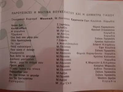 Ερμήνευσαν: Στέλιος Γερασκλής, Μιχάλης Δίμιζας, Χριστίνα Καλλοτίνη, Θύμιος Καραγιάννης, Δάφνη Κιλιμάτου, Εύη Κουλλιά, Κατερίνα Μαρουλή, Ανθίππη Παπαηλία, Αγγελική Σπλαγγούνια.
