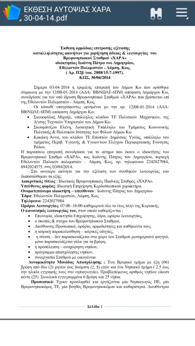 Αναλυτικά το ιστορικό της υπόθεσης του υπό αδειοδότηση Ιδιωτικού Παιδικού Σταθμού, ιδιοκτησίας του κ. Πάτρα Ιωάννη του Δημητρίου στην Κω με διακριτικό τίτλο «ΧΑΡΑ» σύμφωνα με τα δεδομένα και τα στοιχεία που τηρεί η αρμόδια υπηρεσία του Δήμου μας έχει ως εξής: