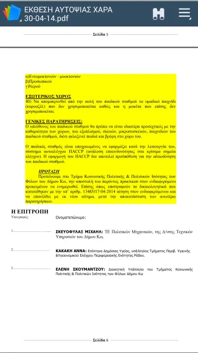 Στις 19/3/2014 διαβιβάστηκε στον ενδιαφερόμενο το πρακτικό της επιτροπής το οποίο εντόπιζε σημαντικές ελλείψεις που έθεταν σε κίνδυνο την υγεία των φιλοξενούμενων βρεφών και προνηπίων.