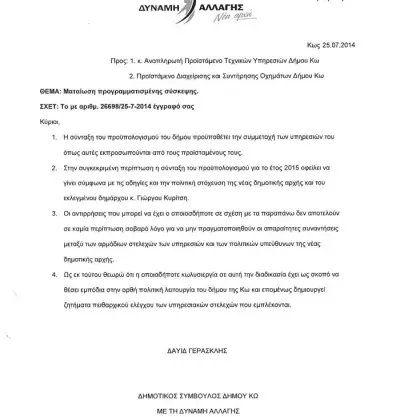 Χωρίς καμιά διάθεση να δοθεί συνέχεια, αλλά προς αποκατάσταση της αλήθειας, αναγκαζόμαστε να δώσουμε στη δημοσιότητα την επιστολή -απειλή- του κ. Δαυίδ Γερασκλή προς τα στελέχη του Δήμου στις 25/07/2014, αφού το δελτίο τύπου της Δύναμης Αλλαγής επιχείρησε να μας διαψεύσει αναφέροντας «Ουδέποτε ο κ. Γερασκλής ή άλλο στέλεχος της ΔΥΝΑΜΗΣ ΑΛΛΑΓΗΣ απείλησε εργαζόμενο του Δήμου. Είναι απόλυτα ψευδές κάτι τέτοιο».
