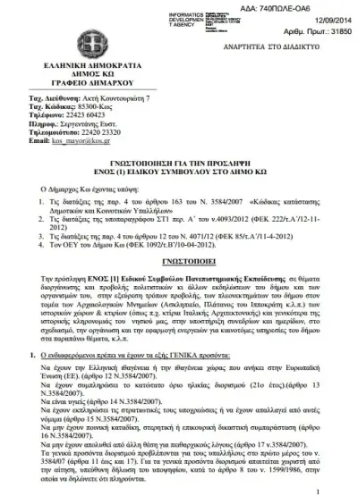 Σύμφωνα λοιπόν με την πρόσκλησή σας (31850/12.09.2014 - ΑΔΑ: 740ΠΩΛΕ-ΟΑ6) ο εν λόγω ή η εν λόγω Ειδική Σύμβουλος θα έχει ως αντικείμενο «τη διοργάνωση και προβολή πολιτιστικών κι άλλων εκδηλώσεων του δήμου και των οργανισμών του, την εξεύρεση τρόπων προβολής, των πλεονεκτημάτων του δήμου στον τομέα των Αρχαιολογικών Μνημείων (Ασκληπιείο, Πλάτανος του Ιπποκράτη κ.λ.π.) των ιστορικών χώρων & κτιρίων (όπως π.χ. κτίρια Ιταλικής Αρχιτεκτονικής) και γενικότερα της ιστορικής κληρονομιάς του νησιού μας, στην υποστήριξη συνεδρίων και ημερίδων, στο σχεδιασμό, την οργάνωση και την εφαρμογή ενεργειών για καινοτόμες υπηρεσίες του δήμου στα παραπάνω θέματα, κ.λ.π.».