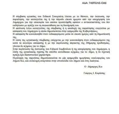 Σας καλούμε να ανακαλέσετε άμεσα την εν λόγω προκήρυξη την οποία προφανώς και θα προσβάλουμε τόσο κατά τη διάρκεια του ελέγχου νομιμότητας από την Αποκεντρωμένη Διοίκηση Αιγαίου όσο και στο Ελεγκτικό Συνέδριο και να την προκηρύξετε εκ νέου τηρώντας τους νόμους. Επίσης για να σας διευκολύνουμε σας λέμε ότι κατά την επίκληση της νομοθεσίας στην απόφασή σας δεν μπορείτε πλέον να επικαλείστε τις διατάξεις της παρ. 4 του άρθρου 12 του Ν. 4071/12 (ΦΕΚ 85/τ.Α΄/11-4-2012) καθώς αυτές αφορούσαν την προηγούμενη Δημοτική περίοδο.