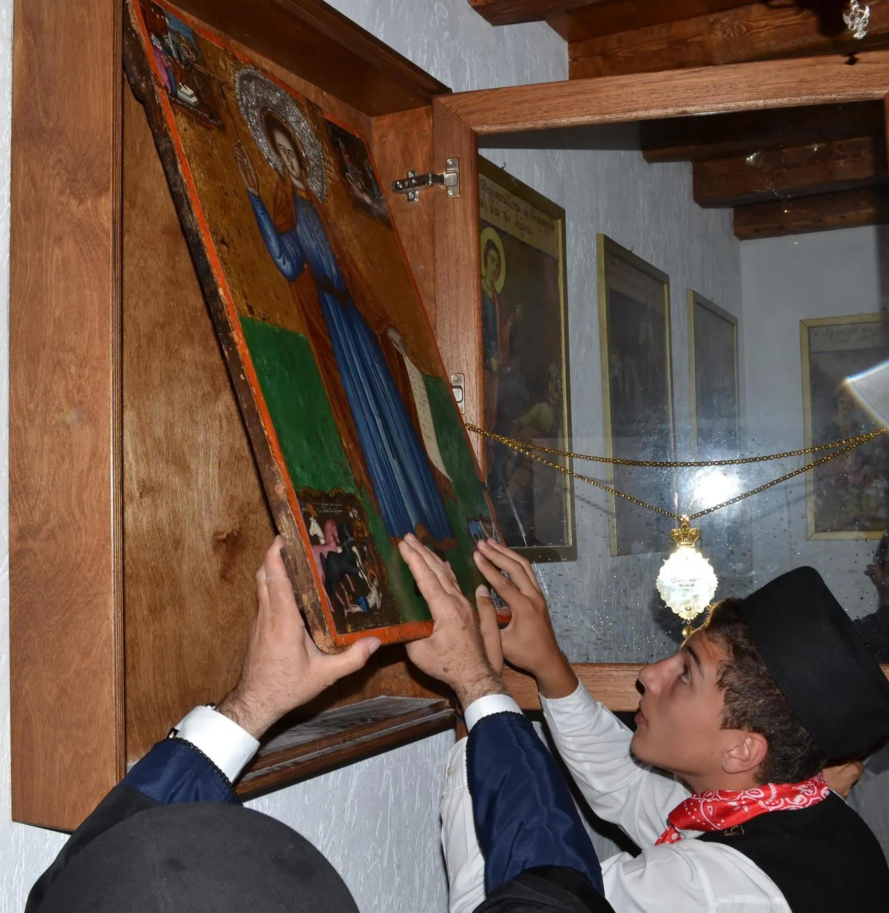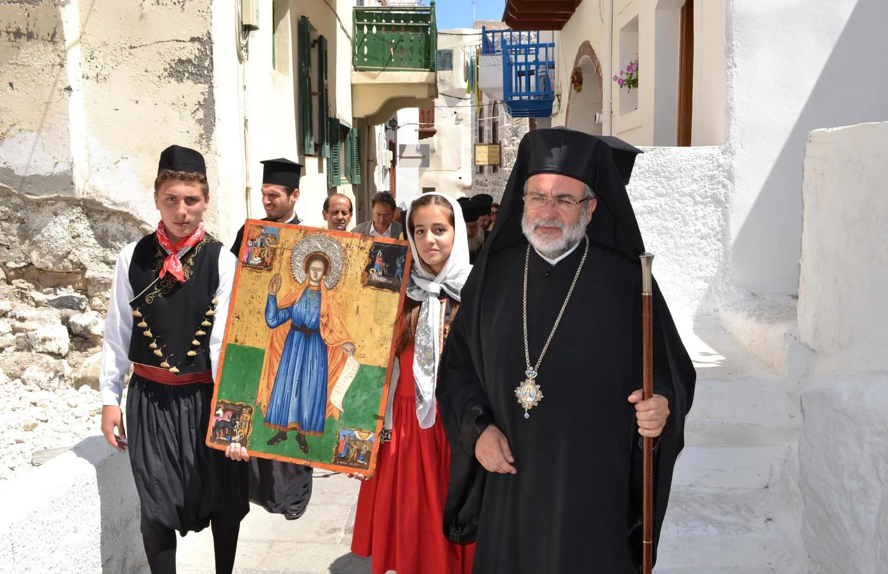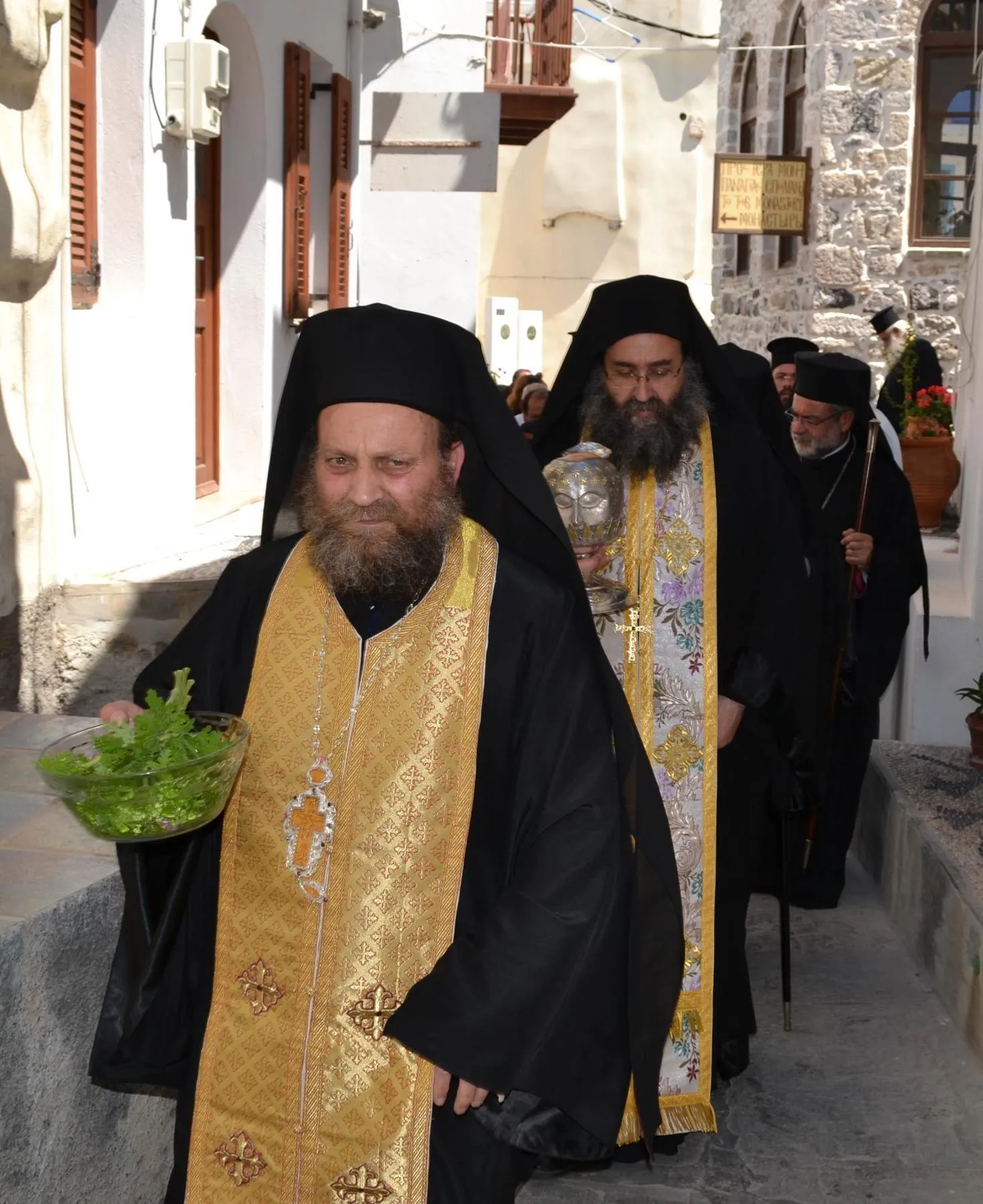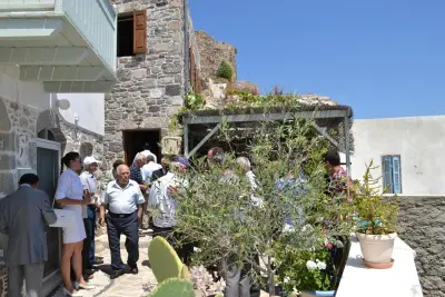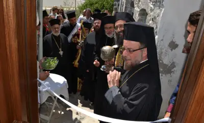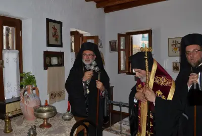 Μετά το πέρας της Θείας Λειτουργίας τελέστηκε η Ακολουθία του Αγιασμού και στη συνέχεια με πομπή όλοι, κλήρος και λαός, κατευθύνθηκαν στην οικογενειακή οικία του Αγίου που βρίσκεται στην γειτονιά του Λαγκαδιού. Η άφιξη στην οικία του ήταν ιδιαίτερα συγκινητική, καθώς ο Άγιος Νικήτας έφυγε μικρό παιδί από το νησί και το σπίτι του και σήμερα, μετά από τριακόσια χρόνια σχεδόν, επέστρεψε σε αυτό. Στην ομιλία του ο Γέρων Δέρκων κ. Απόστολος αναφέρθηκε στην σπουδαιότητα της αποκαταστάσεως της πατρικής οικίας του Αγίου και συνεχάρη τον Σεβασμιώτατο Μητροπολίτη Κώου και Νισύρου κ. Ναθαναήλ για το έργο που επιτελείται στην Κω και στη Νίσυρο. Στη συνέχεια τον λόγο έλαβε ο Μητροπολίτης μας ο οποίος ευχαρίστησε θερμά τους επισκέπτες. Ο Σεβασμιώτατος ευχαρίστησε και τον Ηγούμενο της Ιεράς Μονής Παναγίας Σπηλιανής Πανοσ. Αρχιμ. Στέφανο Καλλιστή για το ανύστακτο ενδιαφέρον του κατά την πορεία των εργασιών που οδήγησε σε αίσια ολοκλήρωση της αναστηλώσεως της οικίας του Αγίου Νικήτα.