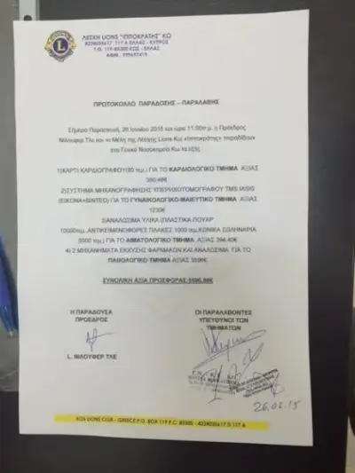 Σήμερα Παρασκευή, 26 Ιουνίου 2015 και ώρα 11.00π.μ. η Πρόεδρος Νίλουφερ Τλε και τα Μέλη της Λέσχης Lions Κω «Ιπποκράτης» παραδίδουν στο Γενικό Νοσοκομείο Κω τα εξής :
