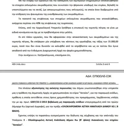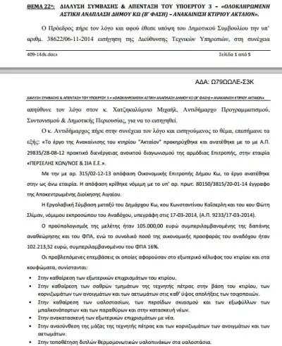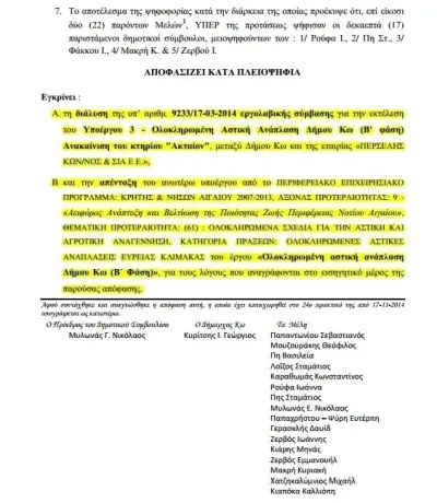 στη συνεδρίαση της 17ης Νοεμβρίου 2014 (22ο θέμα της ημερήσιας διάταξης) η δημοτική αρχή Κυρίτση-υποτακτικών έσπευσαν άρον - άρον να ψηφίσουν τη «διάλυση σύμβασης και απένταξη του υποέργου 3 ολοκληρωμένη αστική ανάπλαση Δήμου Κω Β φάση - Ανακαίνιση κτιρίου ΑΚΤΑΙΟΝ».