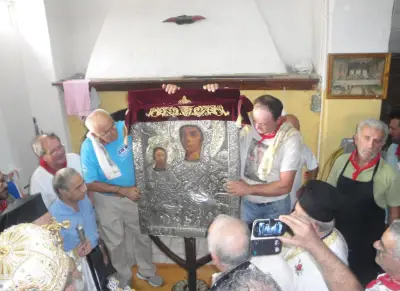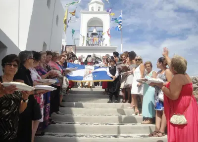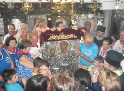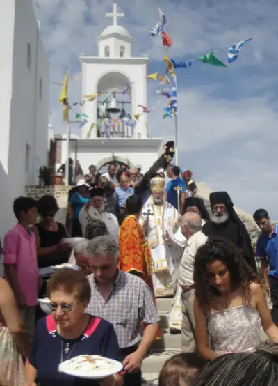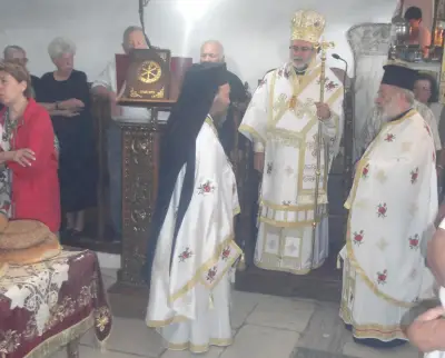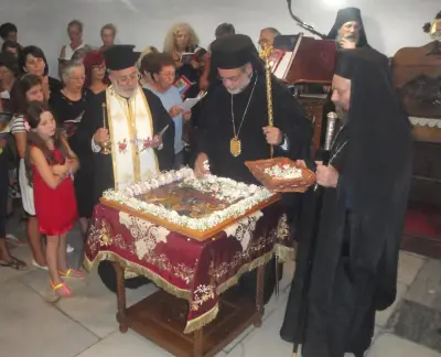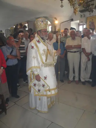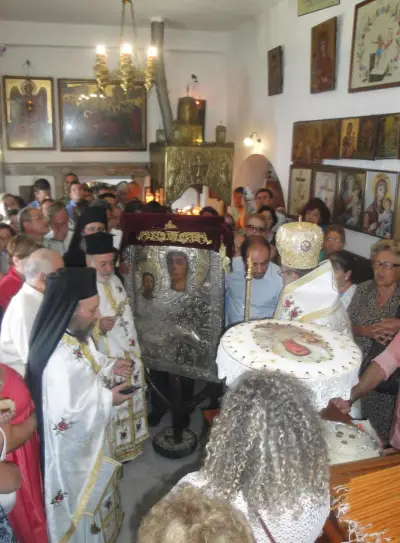 Τήν κυριώνυμο ἡμέρα ὁ Σεβασμιώτατος χοροστάστησε στόν ὄρθρο καί ἐτέλεσε τήν πανυγηρική Θεία Λειτουργία συμπαραστατούμενος ἀπό τόν Πανοσ. Ἀρχιμ. π. Στέφανο Καλλιστῆ καί τόν Αἰδεσ. Πρωτ. π. Ἰωάννη Διακοπαναγιώτη, Γενικό Ἀρχιερατικό Ἐπίτροπο τῆς Ἱερᾶς Μητροπόλεως. Ἐν συνέχειᾳ ὁ Ποιμμενάρχης μας εὐλόγησε τά κόλλυβα τῆς Παναγίας καί προεξῆρχε τῆς λιτανεύσεως τῆς Ἱερᾶς Εἰκόνος στό Μανδράκι μέχρι τήν αὐλή τοῦ Ζωσιμοπούλειου, ὅπου προσεφέρθη ἡ ἑορταστική τράπεζα.
