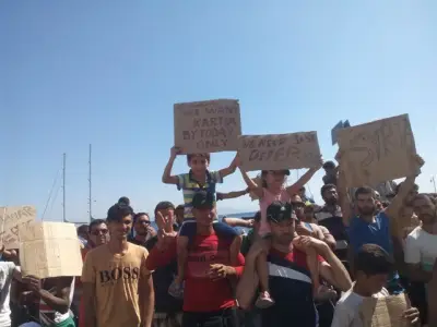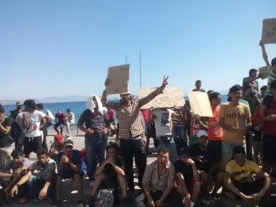 - Είναι δυνατόν να είναι παράνομοι, να φιλοξενούνται στο το νησί μας και να διαδηλώνουν κι’ ολας; Θίγουν από τον τόπο μας; Έχετε ακούσει αφηγήσεις για επεισόδια μπροστά στην Αστυνομικό σταθμό της Κω και βίαιες αντιδράσεις από τους μετανάστες που φορτίζουν με αρνητικά αισθήματα τους πολίτες. Περνώντας από το λιμάνι ένα μικρό αγόρι 7-8 μας ζήτησε νερό. Έχουμε δει πολλούς πολίτες να περνούν από εκεί, να σταματούν στιγμιαία και να αφήνουν νερά, μπισκότα και ψωμί με γρήγορες κινήσεις, αθόρυβα και ταπεινά. Επιστρέφοντας πέσαμε πάνω στην σημερινή διαδήλωση. Περίπου 100 μετανάστες κρατούν αυτοσχέδια χειρόγραφα πανώ-χαρτόνια που γράφουν με μαρκαδόρο το σύνθημα που επαναλαμβάνουν συνεχώς απευθυνόμενοι στο Αστυνομικό τμήμα. Καρτια! Καρτια! WEWANTKARTIA! WENEEDJASTPAPER! WEWANTKARITIATODAY, NOMOREWAIT! SYRIA! WE NEED KARTIA BY TODAY ONLY! Θέλουμε χαρτιά σήμερα, όχι άλλη αναμονή! και μισούμε τον πόλεμο, αγαπούμε την ειρήνη! HATEWAR! LOVEPEACE! SYRIA! Αυτά είναι τα πραγματικά τους αιτήματα! Τι πιο απλό από το να ζητήσουν τα αυτονόητα! Εξουθενωμένοι από το αίσθημα της προσφυγιάς, της ταλαιπωρίας να φτάσουν ως εδώ, της ανάγκης να προλάβουν να φτάσουν στα σύνορα Σερβίας-Ουγγαρίας πριν την ολοκλήρωση του τοίχους, του Ήλιου που τους ζαλίζει στην ατέλειωτη ουρά της αναμονής για το πολυπόθητο ΧΑΡΤΙ για να συνεχίσουν τον δρόμο τους!