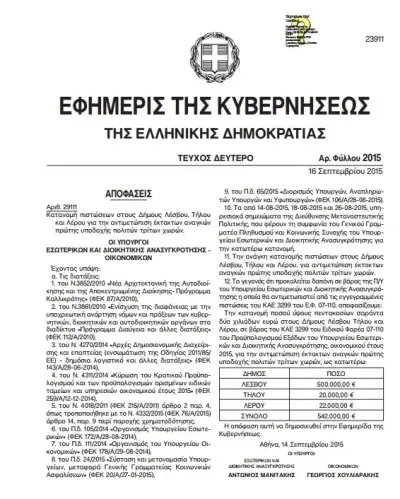 Η Επικεφαλής του Οράματος, Ιωάννα Ρούφα, στην προχθεσινή συνεδρίαση του Δημοτικού Συμβουλίου παρουσίασε το ΦΕΚ της 16ης Σεπτεμβρίου αριθμός φύλλου 23911, τεύχος Β σύμφωνα με το οποίο κατανεμήθηκαν 542.000 ευρώ για την αντιμετώπιση εκτάκτων αναγκών πρώτης υποδοχής πολιτών τρίτων χωρών (επισυνάπτουμε το σχετικό ΦΕΚ).