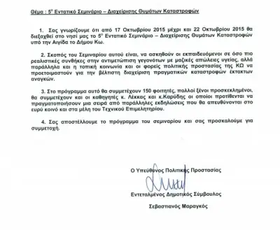 5ο Εντατικό Σεμινάριο–Διαχείρισης Θυμάτων Καταστροφών στην Κω 17-22 Οκτωβρίου
