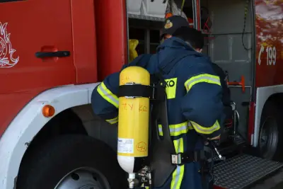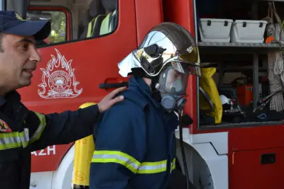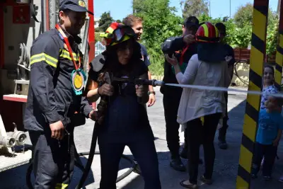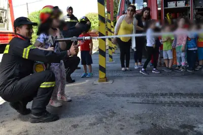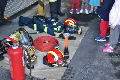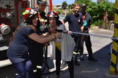 Στη συνέχεια τα παιδιά είχαν την ευκαιρία να δουν από κοντά τα πυροσβεστικά οχήματα και τον εξοπλισμό των πυροσβεστών. Τα στελέχη της υπηρεσίας επεφύλαξαν και μία έκπληξη για τα παιδιά! Όλα τα παιδιά, με την βοήθεια των στελεχών, φόρεσαν ένα - ένα το κράνος του πυροσβέστη και είδαν από κοντά πως λειτουργεί η ρήψη νερού με υψηλή πίεση!