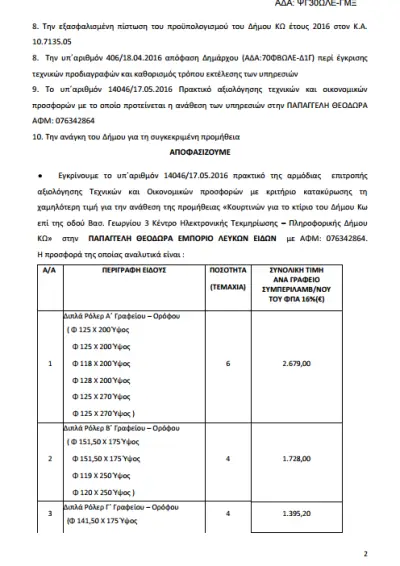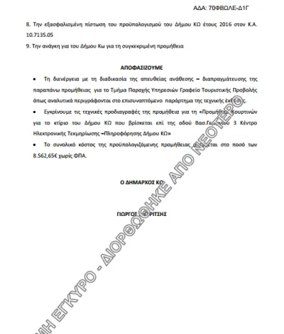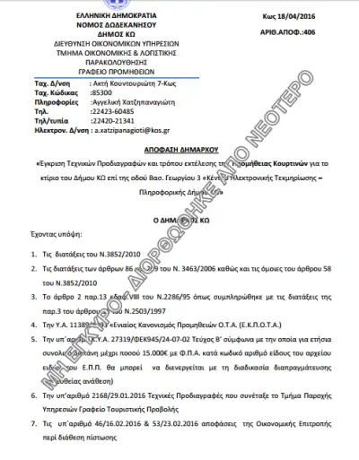 Μέσα σε 48 ώρες, δηλαδή, από την κατάθεση της προσφοράς, 8 μέρες πριν την αξιολόγηση της προσφοράς και 16 ημέρες πριν από την απόφαση του δημάρχου για την ολοκλήρωση της απευθείας ανάθεσης.