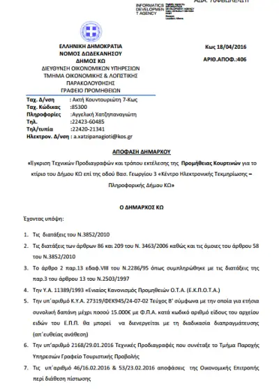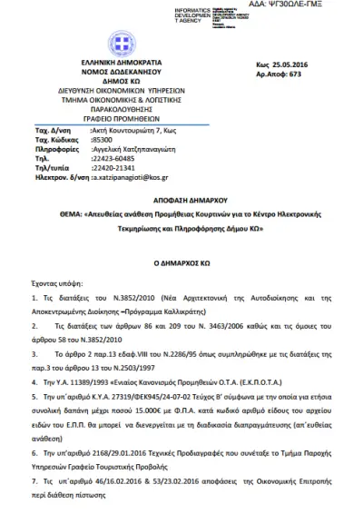 25 Μαΐου 2016: μόλις, χθες, αναρτάται η απόφαση δημάρχου για την απευθείας ανάθεση!!!
