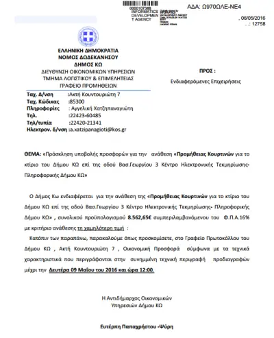 6 Μαΐου 2016:Ημέρα Παρασκευή (ως συνήθως) αναρτάται στο διαύγεια πρόσκληση ενδιαφέροντος για κατάθεση προσφορών, για τις κουρτίνες των 8.500 Ευρώ, με καταληκτική ημερομηνία 9 Μαΐου ημέρα Δευτέρα και ώρα 12 π.μ. (όποιος πρόλαβε τον Κύριον είδε…)