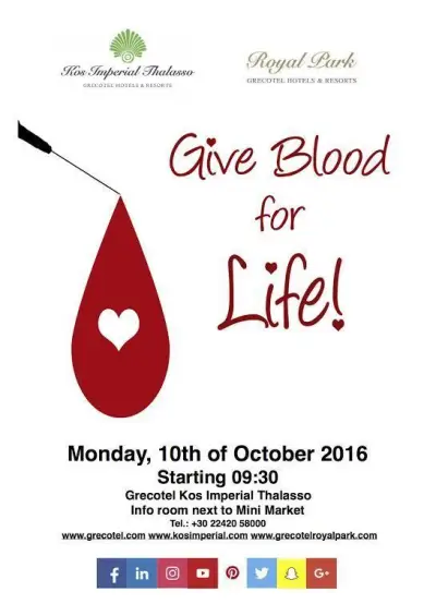 Η διεύθυνση και το προσωπικό των 2 ξενοδοχείων της Grecotel στην Κω, KosImperialThalasso 5* στο Ψαλίδι και RoyalPark 4* στο Μαρμάρι, θέλουν να ευχαριστήσουν την Διοίκηση και το προσωπικό του τμήματος Αιμοδοσίας του Νοσοκομείου Κω για την στήριξη στην οργάνωση της εθελοντικής αιμοδοσίας του προσωπικού που έλαβε χώρα στις 10 Οκτωβρίου κατά την οποία συγκεντρώθηκαν 50 φιάλες αίμα. Έτσι κλείνει ο πλούσιος κύκλος δράσεων για το 2016 όπου αναφέρουμε ενδεικτίκά: