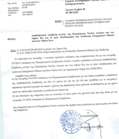 Το πρώτο είναι ένα έγγραφο της Περιφέρειας με ημερομηνία 12 Αυγούστου που υπογράφει ο Αντιπεριφερειάρχης κ. Ζαννετίδης και αναφέρει ότι το έργο της Διαβαθμιδικής Σύμβασης για τον καθαρισμό του Επαρχιακού Δικτύου, θα εκτελεστεί από την Περιφέρεια.
