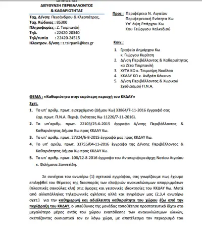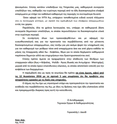 Το δεύτερο έγγραφο είναι του Δήμου Κω, υπογράφεται από εμένα προσωπικά και απευθύνεται στον Έπαρχο. Έχει ημερομηνία 11 Νοεμβρίου και σε αυτό επισημαίνω ότι πρέπει να γίνει ο καθαρισμός των ρείθρων στις επαρχιακές οδούς, τον οποίο είχε αναλάβει η Περιφέρεια και μέχρι εκείνη τη στιγμή δεν είχε γίνει καμία κίνηση παρά το γεγονός ότι είχαν περάσει τρεις μήνες από το έγγραφο με το οποίο η Περιφέρεια μας ανακοίνωνε ότι θα εκτελέσουν το έργο οι υπηρεσίες της.