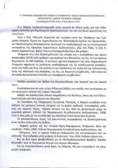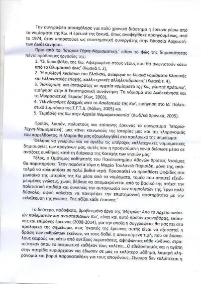 Νιώθω την ανάγκη να ευχαριστήσω θερμά το Δ.Σ της Κωακής αδελφότητας Ρόδου καθώς και τον πρόεδρο κ. Μιλτιάδη Κώτσο που επί σειρά ετών υπηρετεί την ένωση και κρατά τα ήθη και έθιμα της πατρίδας μας προβάλλοντας το νησί μας και τους ανθρώπους του, ανεβάζοντας σε ξεχωριστή θέση την Κω ανάμεσα στους άλλους άξιους παροικιακούς συλλόγους της Δωδεκανήσου. Ιδιαίτερα συγκινητικές ΄οι ομιλίες όλων των συμπατριωτών μας που ζουν και ξεχωρίζουν στη Ρόδο και η ευαισθησία του προέδρου να βρει τα βιβλία που διακρίθηκαν σε Πανδωδεκανησιακό επίπεδο και απέσπασαν τα πρώτα βραβεία, 2006 και 2015. Στο ίδιο πνεύμα και κλιμα με την ομιλία του κ. Κώτσου και της κ. Σούλας Πελεκάνου που μετά την ανάγνωση του πρακτικού δικαιολογούσε τεκμηριωμένα την απόφασή τους να μου χαρίσουν την τιμητική πλακέτα της αδελφότητας της οποίας διετέλεσα γραμματέας, όταν ακόμη εργαζόμουν και ζούσα στη Ρόδο, πριν γυρίσω στην Κω.Τον βουλευτή Δωδεκανήσου κ. Μάνο Κόνσολα που αναφέρθηκε σε άλλες αγαπημένες μου εργασίες που και σαν πρώην Πανεπιστημιακός φαίνεται να τις είχε εκτιμήσει δεόντως, όπως και τον κ. Νίκο Ζωϊδη που θύμισε τα φοιτητικά μας χρόνια στη Θεσσαλονίκη και το δέσιμο που είχαμε οι Δωδεκανήσιοι και οι Κώοι στα δύσκολα χρόνια. Ευχαριστώ ακόμη το Θανάση Καραναστάση για τα καλά του λόγια και τον Πρόεδρο των παροικιακών σωματείων της Ρόδου και πρόεδρο των Κασίων κ. Νίκο Κωνσταντινίδη, ο οποίος δεν ξέχασε και το σύζυγό μου Γιώργο, στον οποίο αφιέρωσα αυτή την τιμή, γιατί αγάπησε την Κω, ,όπως και την ιδιαίτερη πατρίδα του , τη Ρόδο.