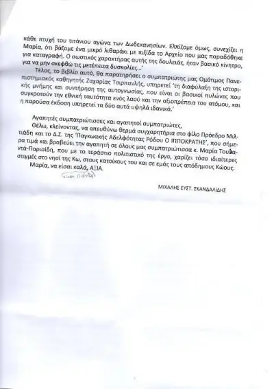 Ακόμη ήταν ιδιαίτερη τιμή για μένα, όταν για το σύνολο των συγγραφικών μου εργασιών μίλησε ο πολυβραβευμένος συμπατριώτης μας και επίτιμο μέλος του Φιλητά κ. Μιχάλης Σκανδαλίδης. Η επισήμανσή του και ως εκπαιδευτικού για τη συμβολή μου στη συγγραφή της τοπικής ιστορίας για τα σχολεία με συγκίνησε πολύ και στην αντιφώνησή μου ανέφερα την ομάδα των συναδέλφων που δουλέψαμε για τον κοινό στόχο. Για την ολοκλήρωση χρειαστήκαμε αρκετά χρόνια και ενώ αξιοιποιήσαμε τη νεότερη έρευνα και την τοπική βιβλιογραφία, παράλληλα ενισχύαμε τη συλλογικότητα και το δέσιμο μεταξύ μας. Όλγα Ασπετάκη Κυρίτση, Μ. Τουλαντά Παρισίδη, Χρυσάνθη Μανωλέρη -Κυρίτση, Μαρία Πανάγου, Ελένη Θετάκη, Μαίρη Φάκκου, Πωλίνα Τουρκομανώλη, Ανθούλα Κίννα, Δ. Κώστογλου, Πόπη Χατζηνικολάου- Θεωνά και Δόμνα Σοφού=Ζώη. Σημειωτέον ότι έγινε επανέκδοση μόνο του πρώτου τόμου όταν ήμουν πρόεδρος της Επαρχιακής επιτροπής Κω- Νισύρου. Σημαντικός ο ρόλος και του Ανδρέα Χατζημιχάλη που συνέβαλε ως Πρόεδρος της Επαρχιακής επιτροπής παιδείας για την ολοκλήρωση του έργου. Έκανα αυτή την αναφορά και δίνω την ομιλία του κ. Σκανδαλίδη για δημοσίευση , γιατί με συγκίνησε που ένας τόσο διακεκριμένος Δωδεκανήσιος παρακολουθεί και εμβαθύνει τόσο στις μικρές, όσο και στις μεγάλες πνευματικές δημιουργίες του τόπου.