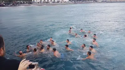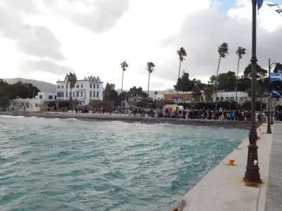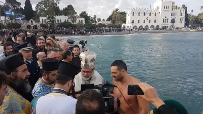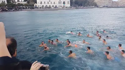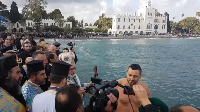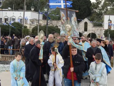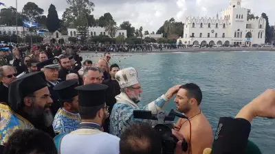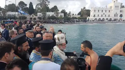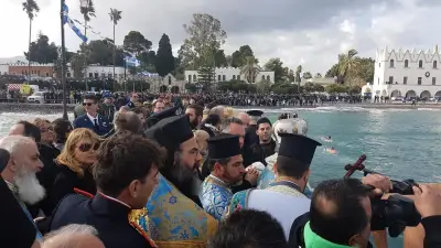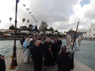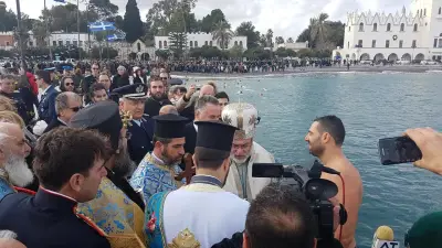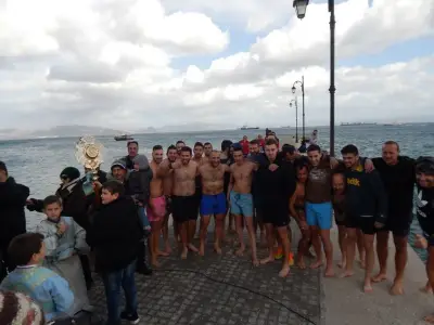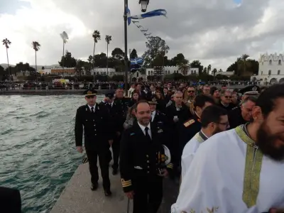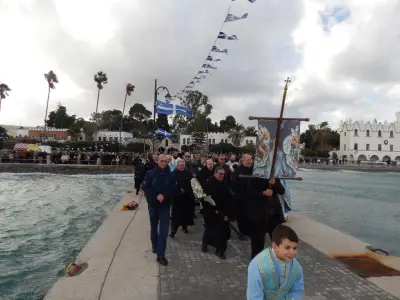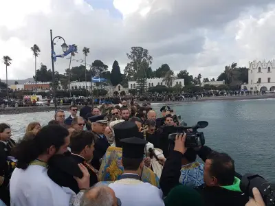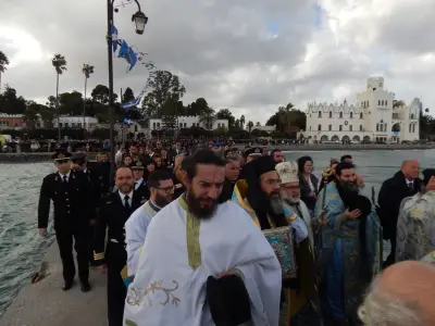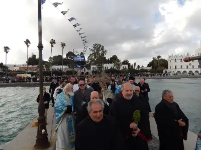 Με ιδιαίτερη λαμπρότητα εορτάστηκαν και στο Νησί μας, τα Θεοφάνεια, αρχικά με την Θεία λειτουργία στο Μητροπολιτικό ναό του Αγίου Νικολάου, χωροστατούντος του Μητροπολίτη κ. Ναθαναήλ, και μετέπειτα με τη ρίψη του Τίμιου Σταυρού, στη σκάλα, παρουσία εκπροσώπων Φορέων και αρκετού κόσμου. Φέτος, βούτηξαν για τον Σταυρό περίπου 20 άτομα, με τον Βασίλη Προύζο να είναι ο τυχερός που τον έπιασε.