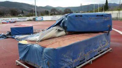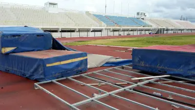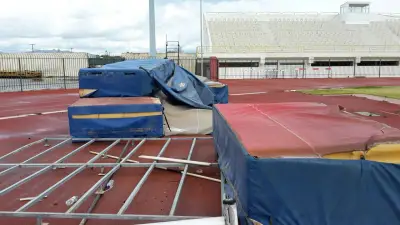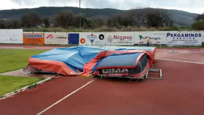 Σύμφωνα με τον υπεύθυνο του γηπέδου κ. Στέργο Χατζηστέργο, ανεμοστρόβιλος ο οποίος χτύπησε χθες το στάδιο ήταν η αιτία να ξεριζωθεί το πακτωμενο στρώμα του ύψους, όπως μπορείτε να δείτε και στις φωτογραφίες.