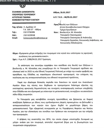 Καμία ουσιαστική απάντηση δεν δίνει το Υπουργείο Τουρισμού στην Ερώτηση που είχε καταθέσει ο Τομεάρχης Τουρισμού της Νέας Δημοκρατίας και Βουλευτής Δωδεκανήσου, κ. Μάνος Κόνσολας, για τα μέτρα τουριστικής προβολής και στήριξης των νησιών που υπέστησαν τις αρνητικές συνέπειες του μεταναστευτικού.