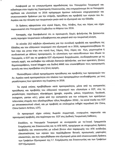 -Το Υπουργείο Τουρισμού δεν είναι σε θέση να δώσει στοιχεία για το ποια ποσά διατέθηκαν, αναλυτικά και ανά νησί (Κως, Λέσβος, Χίος, Σάμος, Λέρος) για την τουριστική προβολή και την αποκατάσταση της εικόνας τους ως τουριστικών προορισμών το 2015 και το 2016. Προφανώς γιατί εκεί θα αποκαλυφθεί η αλήθεια.