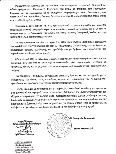 Κυρία Υπουργό Τουρισμού