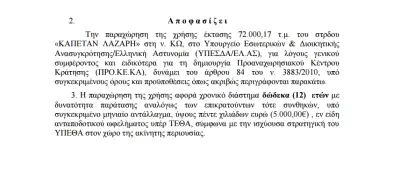 Η παραχώρηση της χρήσης αφορά χρονικό διάστημα δώδεκα (12) ετών με δυνατότητα παράτασης αναλόγως των επικρατούντων τότε συνθηκών, υπό συγκεκριμένο μηνιαίο αντάλλαγμα, ύψους πέντε χιλιάδων ευρώ (5.000,00€)