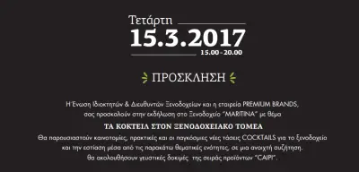 Η Ένωση Ιδιοκτητών & Διευθυντών Ξενοδοχείων και η εταιρεία PREMIUM BRANDS, σας προσκαλούν στην εκδήλωση στο Ξενοδοχείο “MARITINA” με θέμα ΤΑ ΚΟΚΤΕΙΛ ΣΤΟΝ ΞΕΝΟ∆ΟΧΕΙΑΚΟ ΤΟΜΕΑΘα παρουσιαστούν καινοτομίες, πρακτικές και οι παγκόσμιες νέες τάσεις COCKTAILS για το ξενοδοχείο και την εστίαση μέσα από τις παρακάτω θεματικές ενότητες, σε μια ανοιχτή συζήτηση. θα ακολουθήσουν γευστικές δοκιμές της σειράς προϊόντων “CAIPI”.