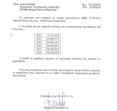 Στις 27/9/2016 καταθέσαμε αίτημα ζητώντας να ενημερωθούμε σχετικά με την υπηρεσία φύλαξης στη Μαρίνα της Κω. (δείτε το αίτημα)