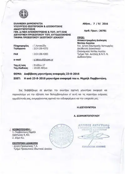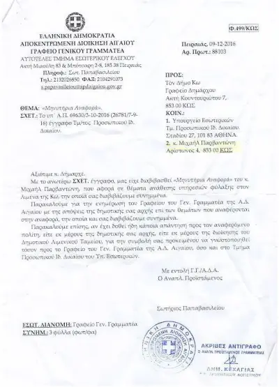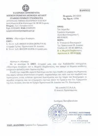 Δύο έγγραφα τους έχει στείλει ο Γενικός Γραμματέας της Αποκεντρωμένης ζητώντας τους εξηγήσεις σχετικά με τη μηνυτήρια αναφορά που έχω καταθέσει από τον Σεπτέμβριο του 2016 και ακόμα δεν απάντησαν. Τα βγάζω στον αέρα γιατί δεν μπορώ να ακούω για νομιμότητα και διαφάνεια την ώρα που η κοινωνία βοά και ο κοςΜαραγκός ομολογεί ότι η εταιρεία ασφάλειας που είχε μέχρι και πριν από ένα μήνα στην Μαρίνα τα μάζεψε και εξαφανίστηκε. Έτσι απλά...!!!