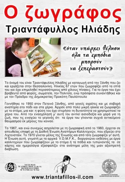 Το όνομά του είναι Τριαντάφυλλος Ηλιάδης με καταγωγή από την Ξάνθη που ζει και εργάζεται στην Θεσσαλονίκη. Ηλικίας 67 ετών που ζωγραφίζει από τα επτά του και έχει επιμεληθεί περισσότερους από χίλιους πίνακες. Για το έργο του έχει βραβευτεί από φορείς, σωματεία, την Πολιτεία, ενώ πρόσφατα συναντήθηκε και με τον Πρόεδρο της Δημοκρατίας Προκόπη Παυλόπουλο.