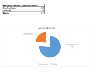 Το μήνα Μάρτιο υποβλήθηκαν 144 αιτήματα. Διεκπεραιώθηκαν τα 110 (ποσοστό υλοποίησης 76%) και είναι σε εξέλιξη ή παραμένουν σε εκκρεμότητα 34.