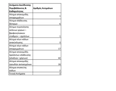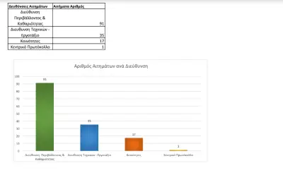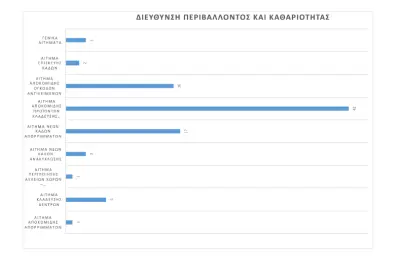 Τα περισσότερα αιτήματα (91) αφορούν αιτήματα που άπτονται των αρμοδιοτήτων της Διεύθυνσης Καθαριότητας και Περιβάλλοντος.