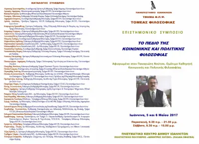 Tο Πρόγραμμα για τo Επιστημονικό Συμπόσιο αφιερωμένο στον κ. Παναγιώτη Νούτσο, Ομότιμο Καθηγητή Κοινωνικής και Πολιτικής Φιλοσοφίας με θέμα: Το πεδίο της Κοινωνικής και Πολιτικής Φιλοσοφίας που θα πραγματοποιηθεί στα Ιωάννινα, την Παρασκευή 5 και το Σάββατο 6 Mαϊου 2017 στο Πνευματικό Κέντρο Δήμου Ιωαννιτών [Πολιτιστικός Πολυχώρος "Δημήτρης Χατζής"] (Παλαιά Σφαγεία)