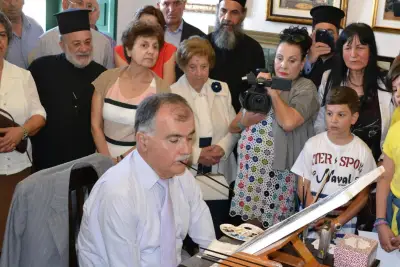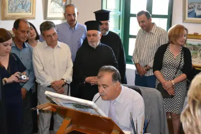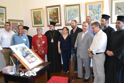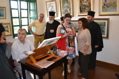Ὁ κ. Τριαντάφυλλος Ἠλιάδης ἀναφέρθηκε στήν ἀπόφασή του νά ξεκινήσει νά ζωγραφίζει μέ τό στόμα καί εὐχαρίστησε τόν Σεβασμιώτατο γιά τή δυνατότητα νά παρουσιάσει τό ἔργο του στήν Κῶ.